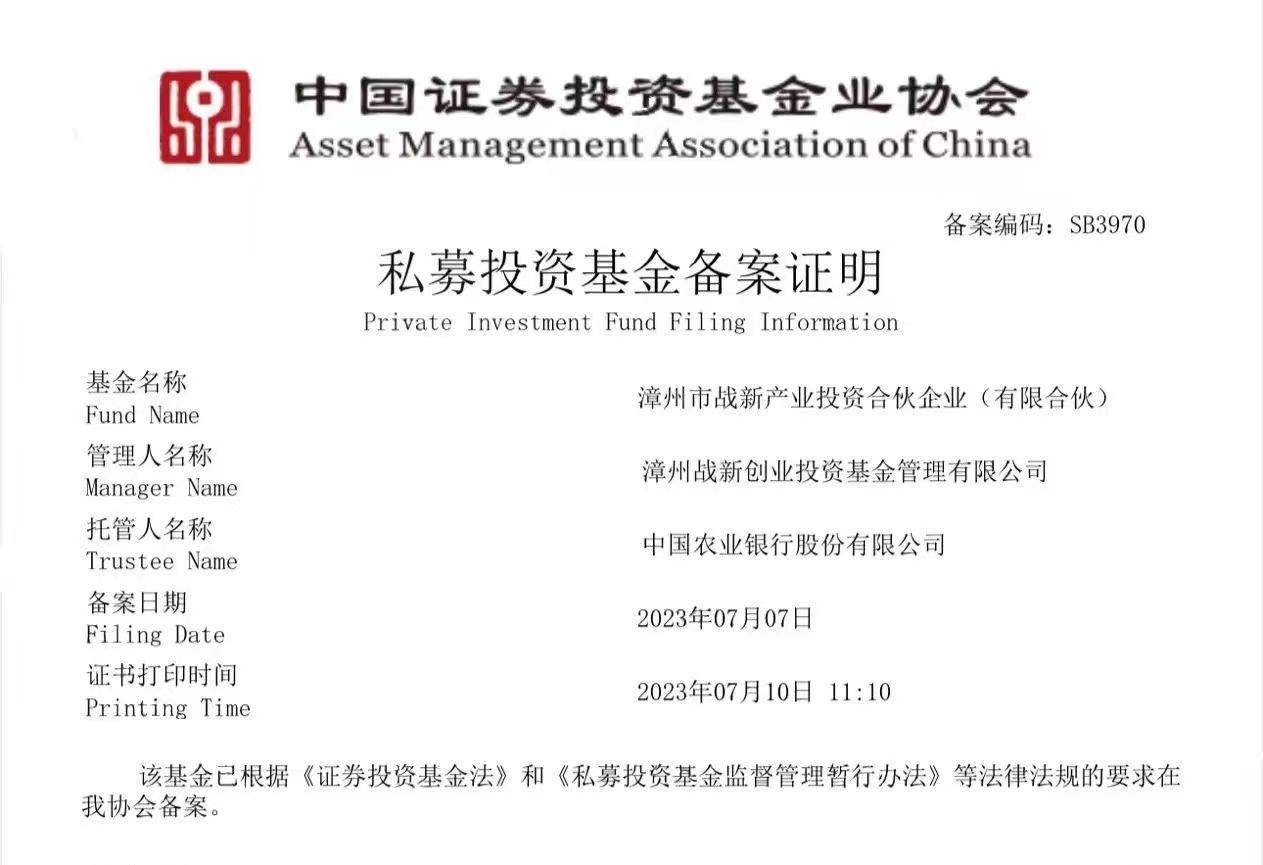 漳州市战新产业发展母基金顺利完成中国证券投资基金业协会基金产品备案
